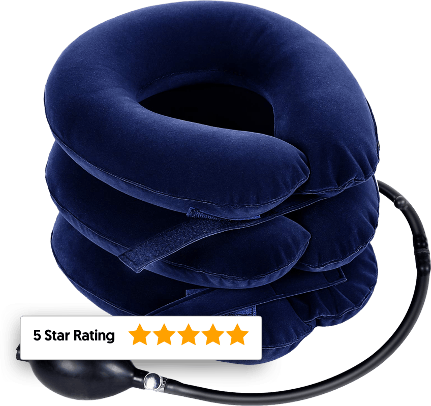 It’s a super useful inflatable neck device that gently adds pressure upwards on your head to slowly pull it away from your neck and shoulders, allowing you to relieve your pain in any position you'd like - sitting on the couch, standing in your living room, and even driving your car!